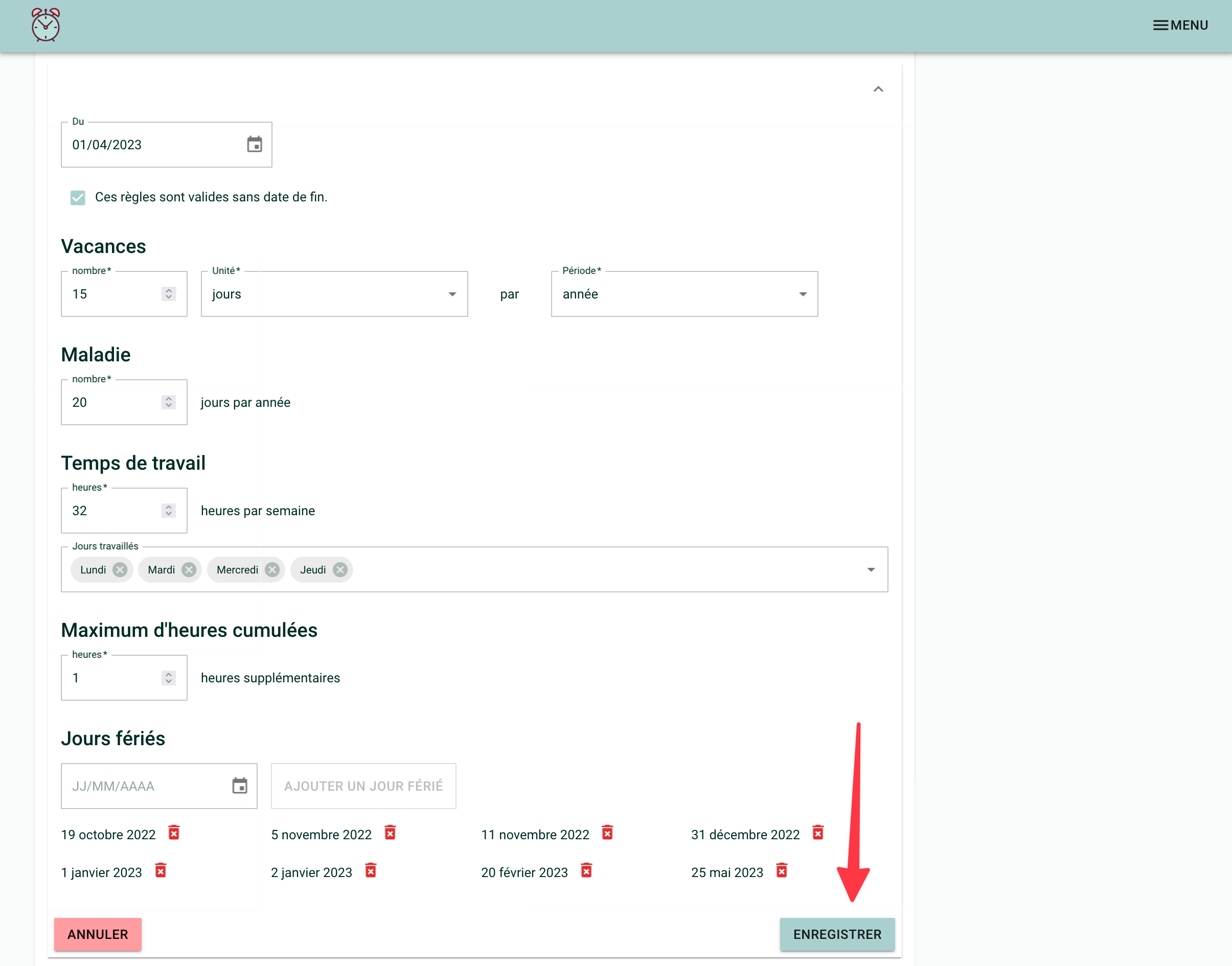 Remplissez la date de début et les nouvelles règles pour cette période puis enregistrez.