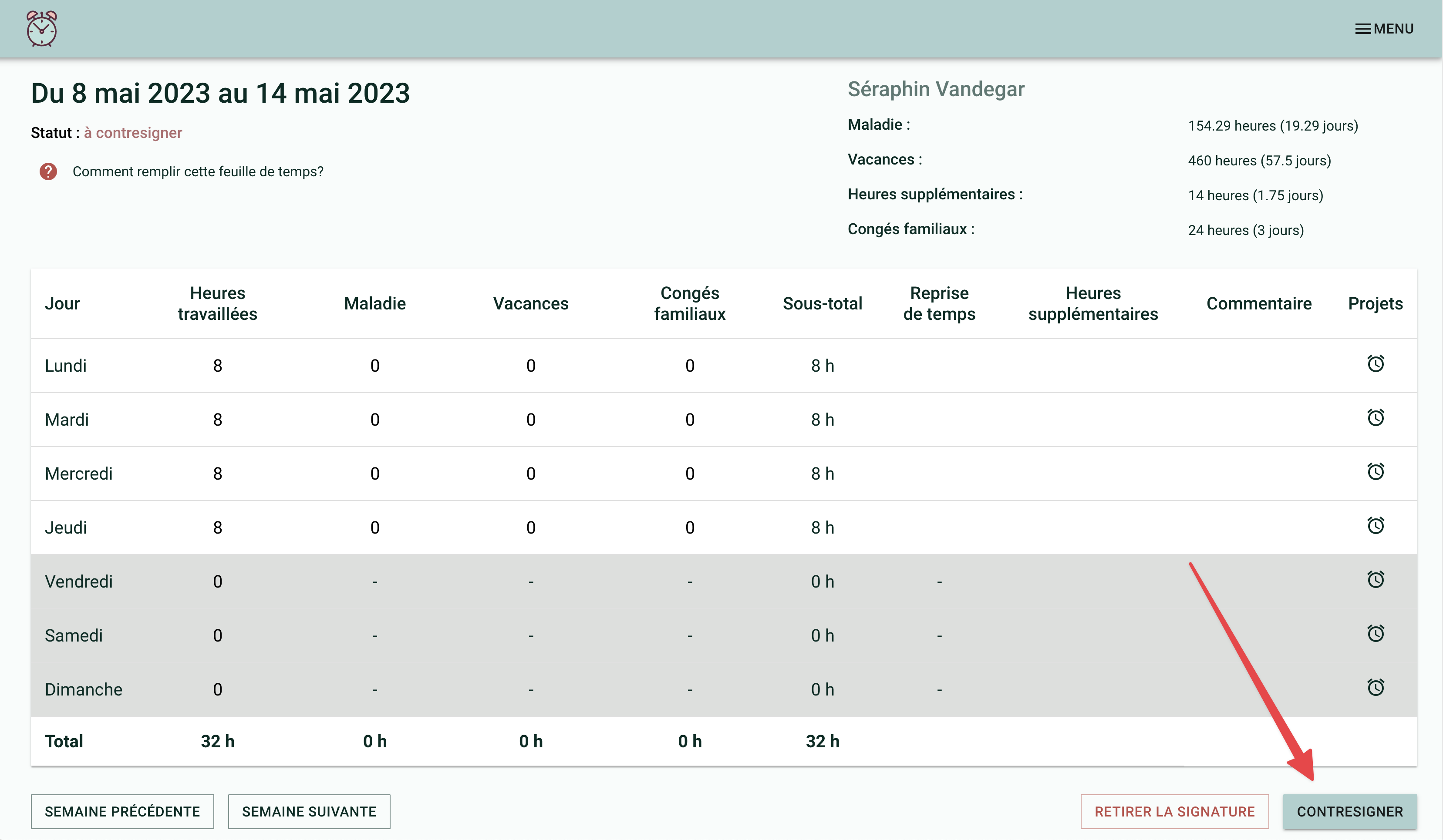 Vous pouvez maintenant voir tous les détails d'une feuille de temps et la contresigner si elle est correcte.