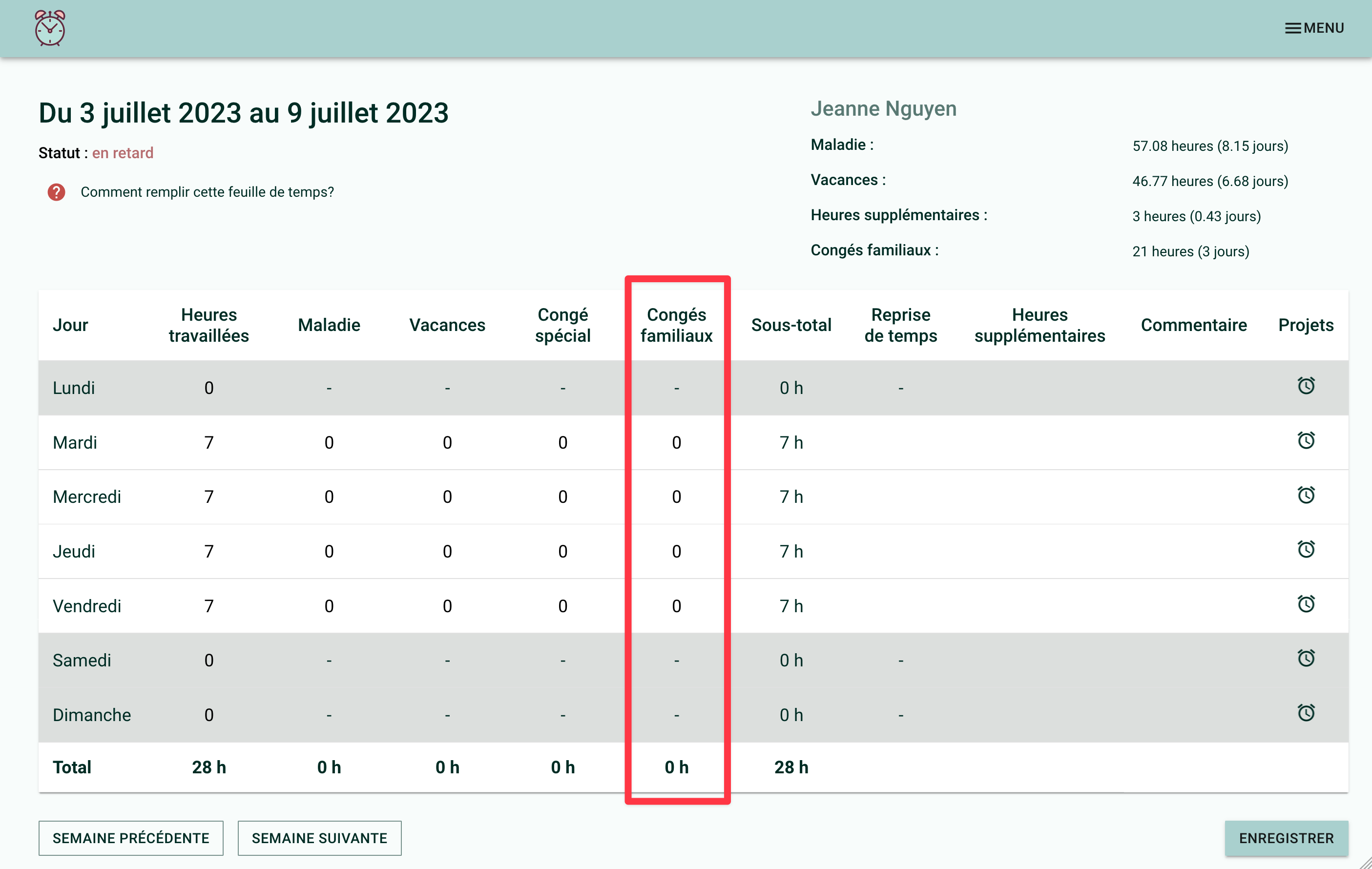 Une fois la fonctionnalité activée, une colonne portant le nom que vous avez choisi apparait dans les feuilles de temps des employé·es.